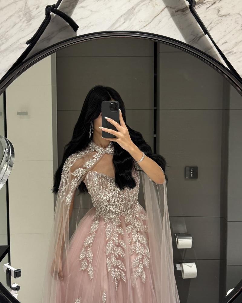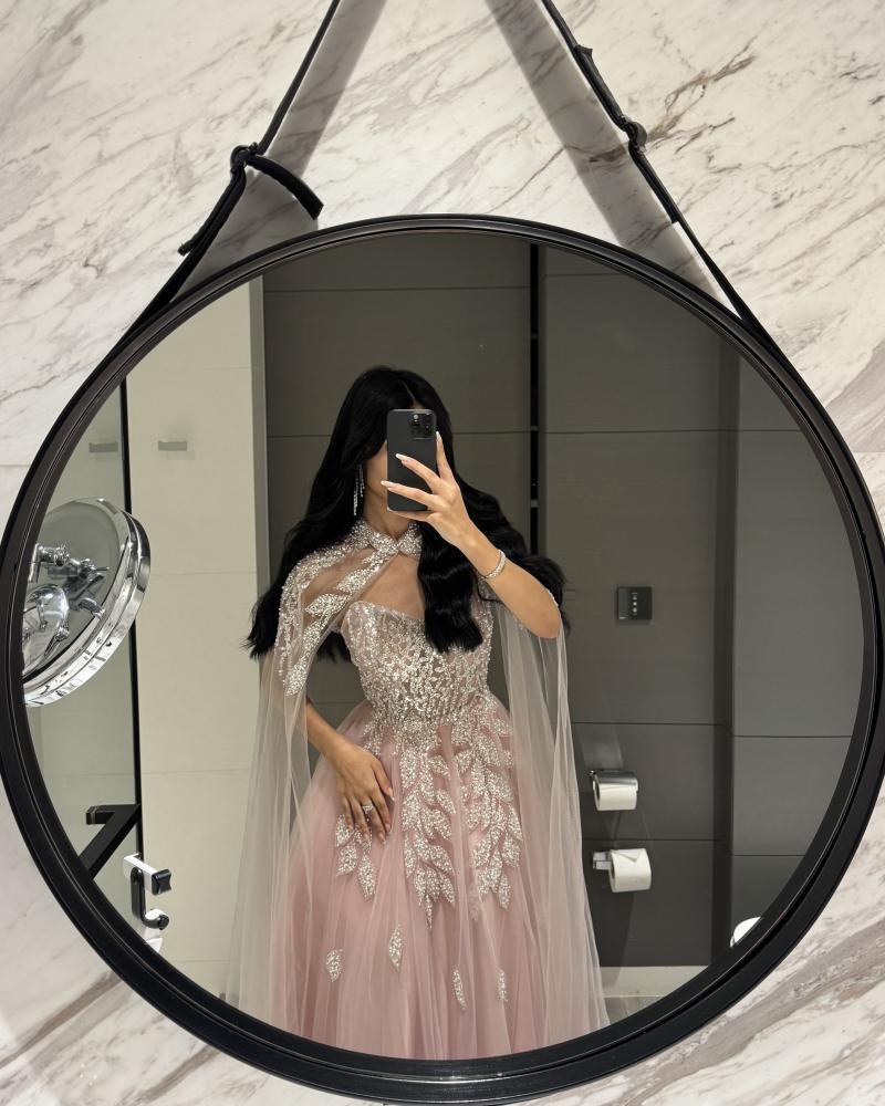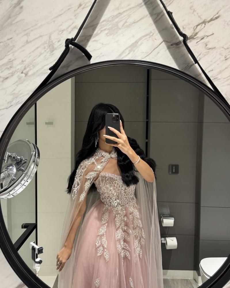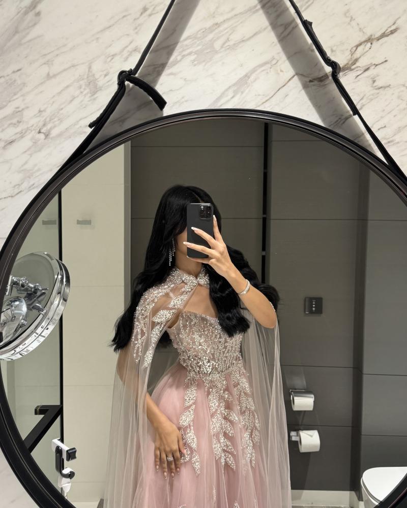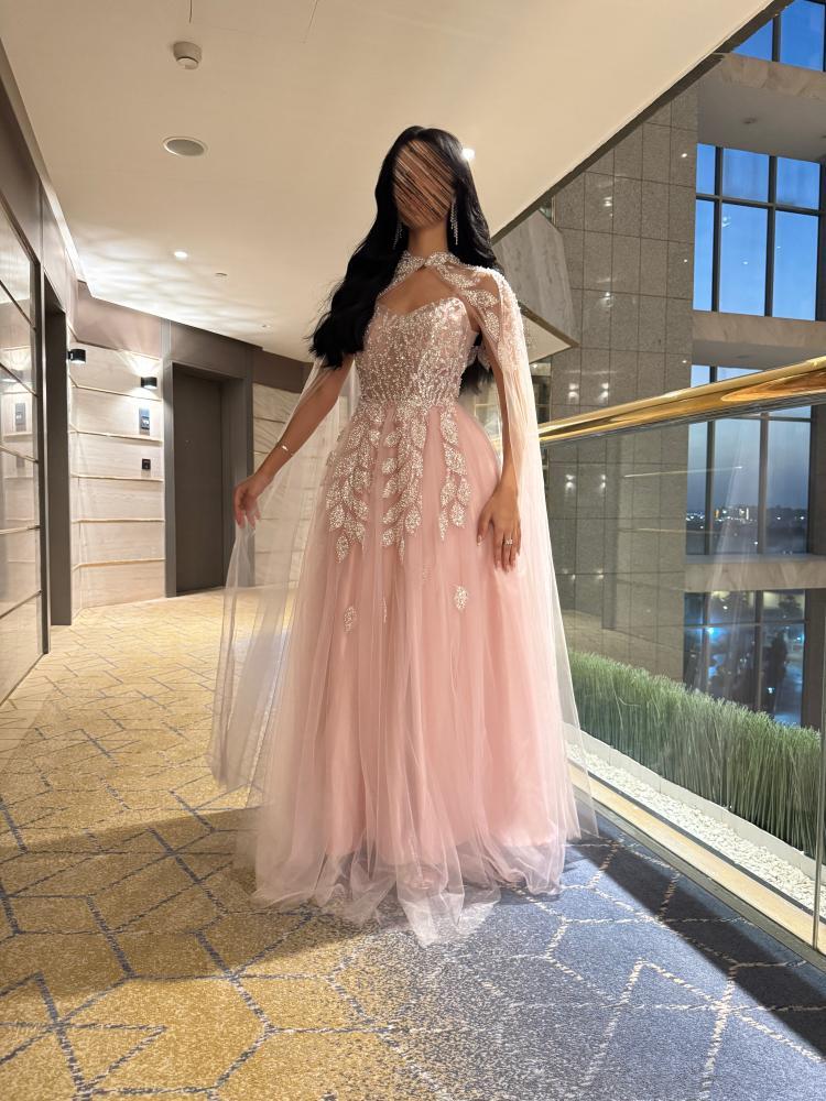 سطح الفستان مزدان بتطريزات غنّية من الخرز والترتر باللونين اللحمي والفضّي، على شكل أوراق ونقوش زهرية متفرّعة قيَّمها تناغم الألوان على قماش قوي الملمس (على الأرجح ساتان مُنعَم)، تعكس الضوء بلمعان ناعم. التصميم بلا أكمام أسفل الشال، ما يمنح الإطلالة توازناً بين الجرأة والرقي