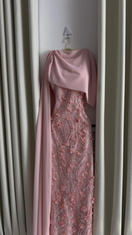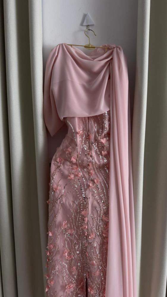 فستان ملكي أنيق بقصة ضيقة، مزين بالكامل بشك وترتر يدوي، بفتحة جانبية وقطعة كاب جانبية شفافة تضيف لمسة درامية ساحرة.